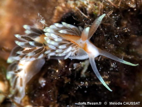 Les cérates translucides présentent un diverticule central brun rougeâtre, se terminant par un court cnidosac blanc. Une bande orange entourée d'un fin anneau rouge subapical est présente. La glande digestive formant une ligne digestive dorsale médio-dorsale brun-rouge, visible à travers le manteau du troisième groupe de cérates jusqu'au dernier.