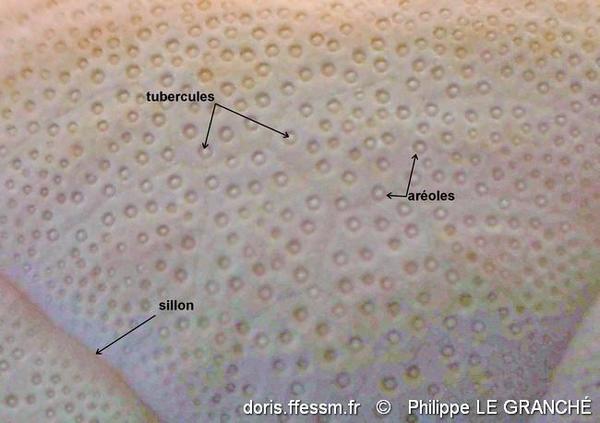 Sur cette partie de la face orale en gros plan, on distingue les tubercules sur lesquels sont articulées les radioles ainsi que les aréoles qui entourent ces tubercules.