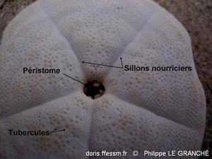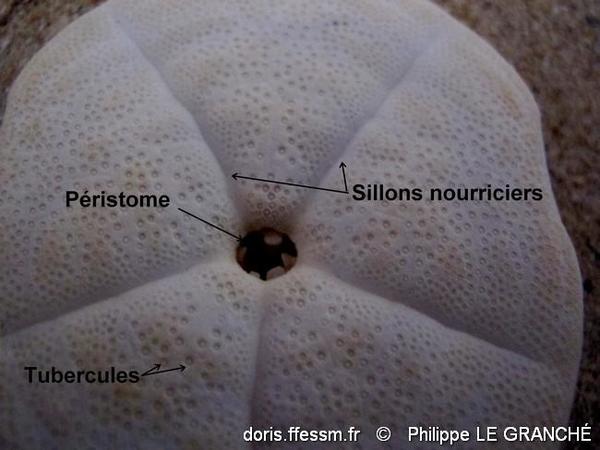 On observe au centre de la face ventrale ou orale la bouche entourée de cinq sillons nourriciers, droits et disposés en étoile.