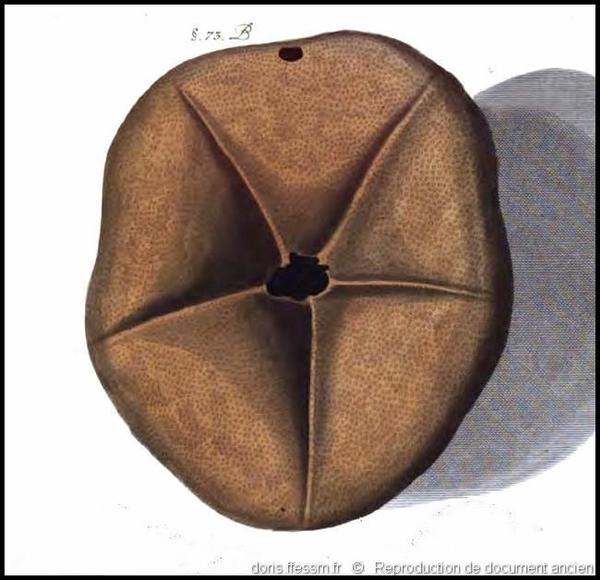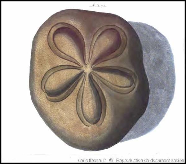 Sur ce dessin ancien de la face aborale, on remarque bien le corps irrégulier, renflé et les 5 ambulacres imitant une fleur à 5 pétales.