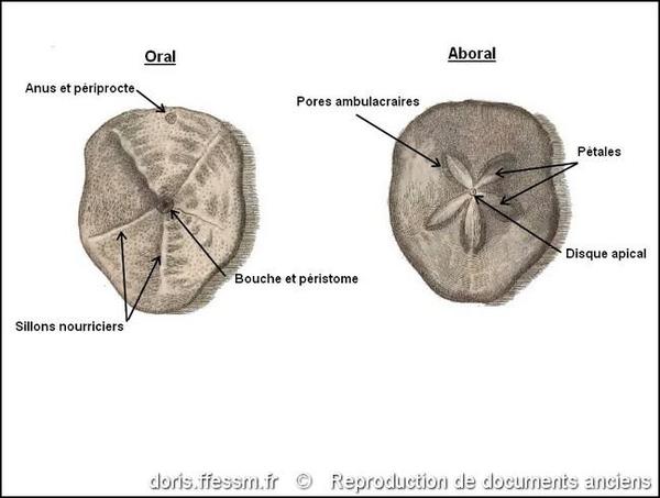 Ce dessin met en évidence les différences morphologiques entre faces aborale et orale de cet oursin des sables.