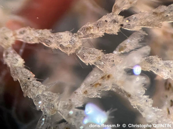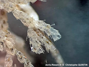 Zones DORIS : ○ [Atlantique Nord-Est, Manche et mer du Nord françaises], ● Atlantique Nord-Ouest, ○ [Méditerranée française]Photographie d'une colonie sur une Sphaerococcus coronopifolius en milieu naturel
