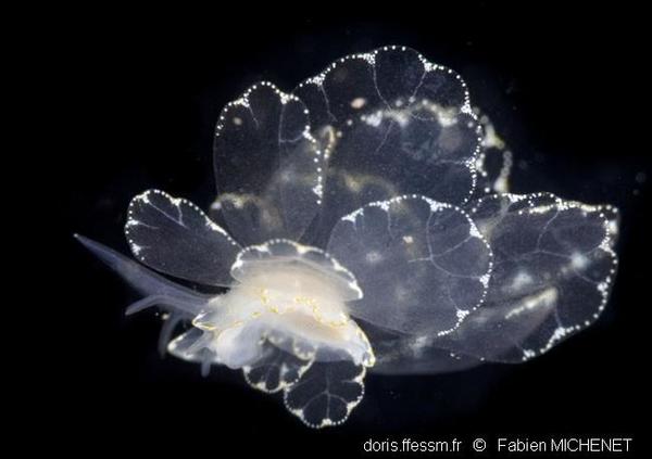Ici, les cérates sont translucides blancs. Ils ressemblent à des petites bulles irrégulières bordées d'une ligne blanche, elle-même ponctuée de taches opaque d'où partent de discrètes ramifications opaques vers le centre du cérate.