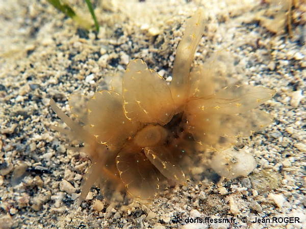 Les yeux se situent à la base des rhinophores. Ceux-ci sont bifurqués, comme on le voit bien sur le rhinophore gauche de l'animal.