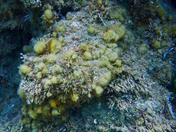 Algue épiphyte* formant des boules filamenteuses de couleur jaunâtre à brun clair pouvant atteindre 8 cm de diamètre. Attention, une autre algue impossible à discriminer autrement qu'au microscope (Choristocarpus tenellus) est présente en Méditerranée. Cet individu a été identifié au microscope.