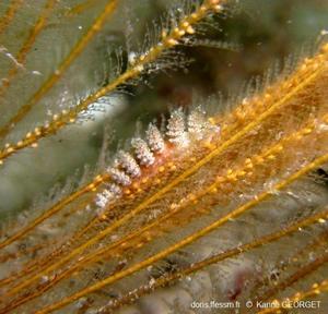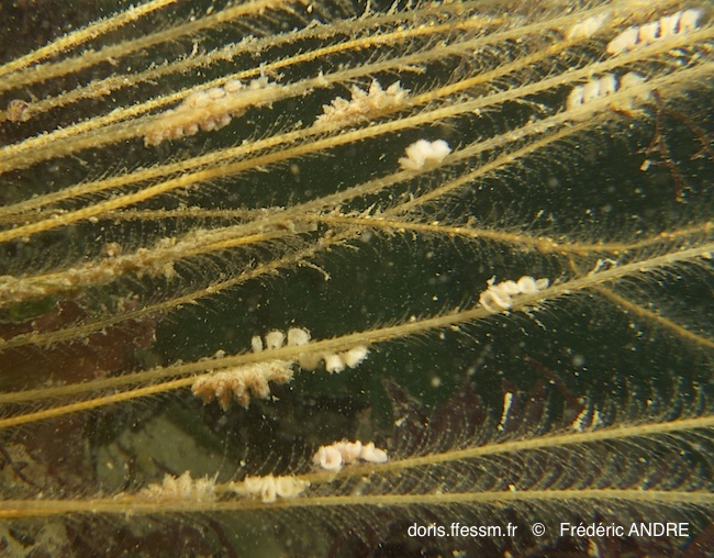 Vue du côté droit. Le Doto pond sur une Nemertesia antennina..Sur le flanc, entre les cérates*, on devine les picots caractéristiques Les points noirs sur la gaine du rhinophore* sont bien visibles.