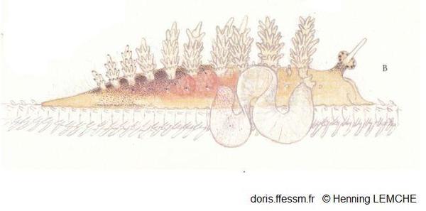 Les picots, sur les flancs, entre les cérates, sont bien visibles. Le voile oral, les gaines des rhinophores