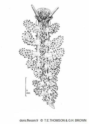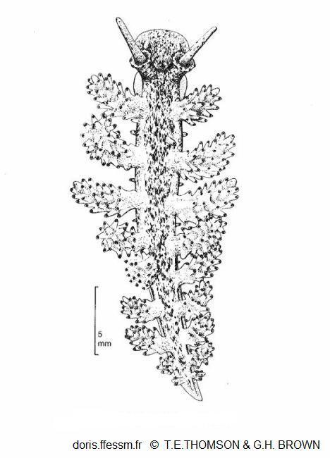 Trés petit doto associé aux hydraires Nemertesia antennina et caractérisé par une série de petits "picots" en bordure du manteau, sous les cerates, tous deux marqués de points rouge foncé
