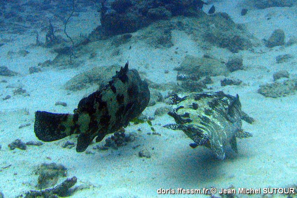 - Le mérou nébuleux Epinephelus erythrurus : la robe ne comporte pas de points sombres et la taille est plus modeste, ce dernier est absent des zones couvertes par DORIS.