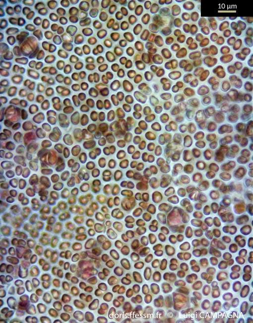 Les carpospores rondes à elliptiques mesurent 7 à 10 µm de diamètre.