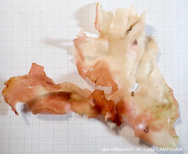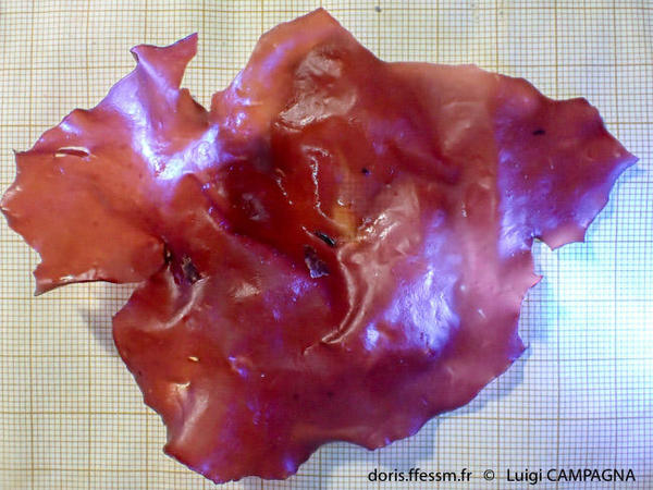 Les feuilles échouées de posidonie donnent l'échelle du thalle de cette algue rouge.