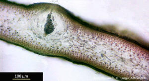 En section transversale, on observe une structure multiaxiale avec un cortex pseudo-parenchymateux et une médulla* filamenteuse lâche constituée de filaments obliques ramifiés.
