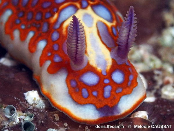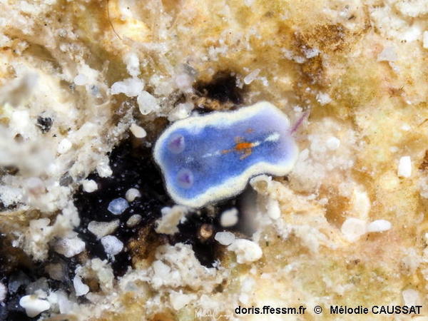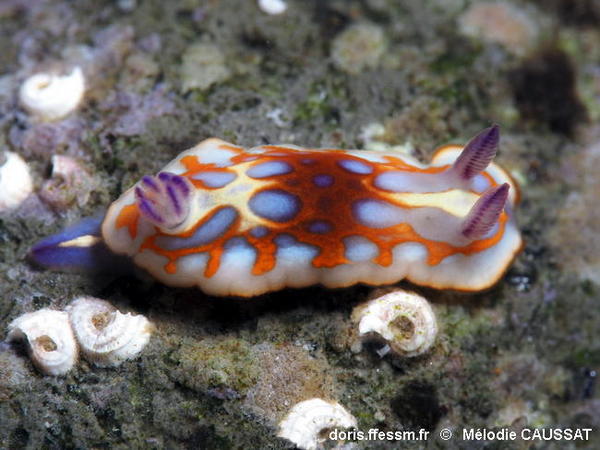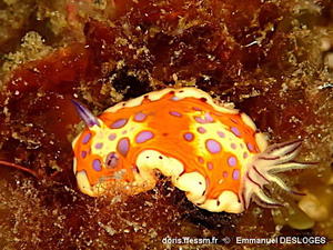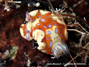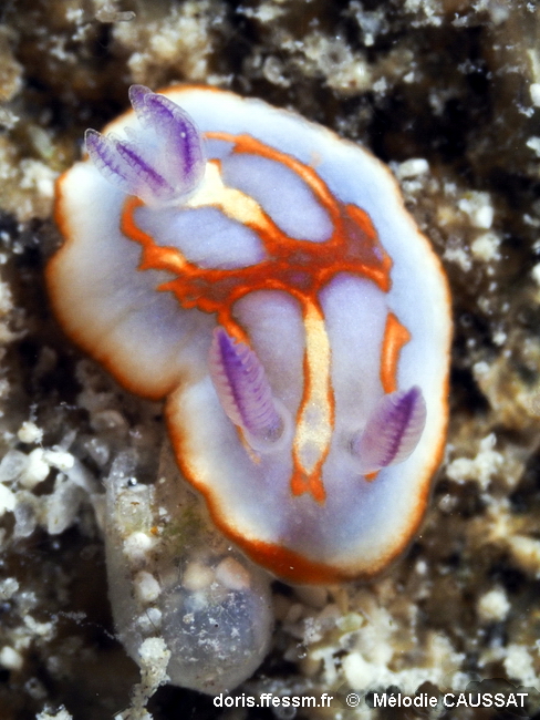 Le motif orange très peu étendu laisse transparaître beaucoup de la couleur de fond du manteau. Il s'agit peut-être d'un jeune individu en cours de croissance. Le panache branchial ne semble pas non plus être complètement développé.
