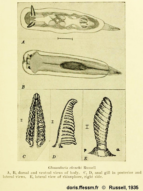 L'animal y est dessiné vu de dos (A), de dessous (B), ainsi qu'un feuillet branchial vu de face et latéralement (C et D). Enfin (E), une vue latérale du rhinophore droit est montrée avec la face antérieure à droite.