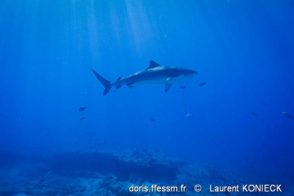 Une jeune femelle vient vers le photographe. Les sillons labiaux sont clairement visibles. La caudale, hétérocerque* est assez effilée en sa partie supérieure.
