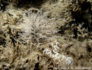 Janolus hyalinus a déposé sa ponte caractéristique, bien visible sur une ascidie (Ciona sp.) avant de s'éloigner. C'est sur photo qu'il est repérable, caché derrière une autre ascidie, juste en dessous. La touffe de cérates pointus peut se confondre avec les bryozoaires dont ce nudibranche se nourrit dont on voit un massif sur la droite