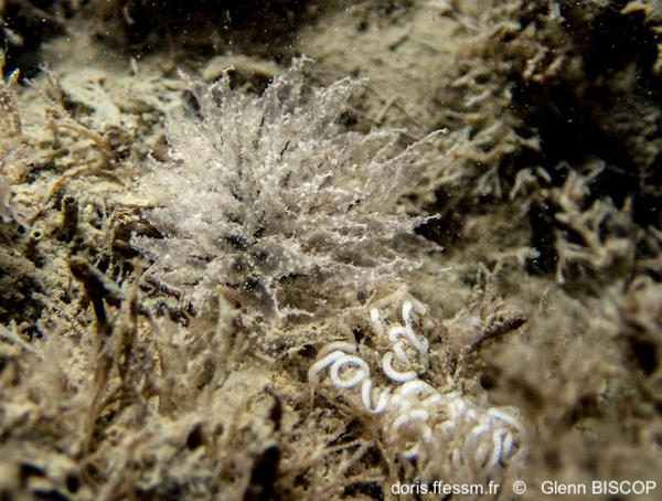 Le ruban fin de la ponte forme des vagues et se distingue par sa couleur crème sur fond de bryozoaires et de sédiments déposés. L'observateur attentif pourra alors tenter de repérer le géniteur à proximité. C'est le cas ici avec Janolus hyalinus en arrière-plan, très mimétique de son environnement.