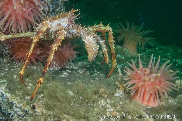Cet individu évolue sur un fond rocheux caractéristique de Les Escoumins. On note la présence des anémones criblées Cribrinopsis similis.