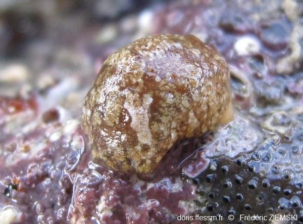 Ce petit gastéropode ressemble à un nudibranche doridien, mais il s'agit bien d'un prosobranche. Contrairement à ses cousines les limaces de mer, il ne présente ni branchies* ni tentacules* sur son dos. Sa longueur atteint 20 mm, pour une largeur de 15 mm. Son manteau* en dôme (voire en cône) recouvre complètement la coquille, et porte de larges tubercules* irréguliers. Sa coloration est variable : elle peut être pourpre ou tachée de gris-lilas avec des points blancs, jaune marbré avec du blanc et du rouge, ou jaune citron avec des points clairs. Un repli du bord du manteau antérieur forme un siphon* cylindrique exhalant pour la cavité palléale*. Sur la tête on observe deux tentacules lisses et clairs (avec à leur base un petit œil noir), ils dépassent du bord antérieur du manteau. L'extrémité postérieure du pied est allongée et dépasse également du bord du manteau. Le mâle a un pénis* externe. Il n'y a pas d'opercule*.