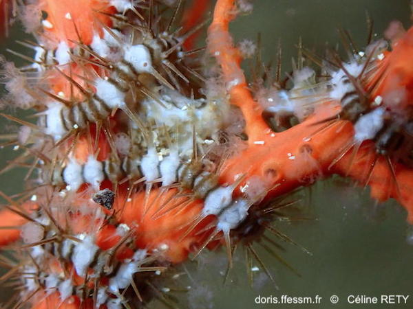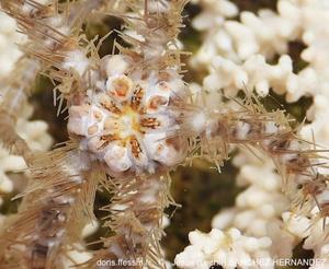 L'association apparemment obligatoire avec les gorgones, le patron de coloration très stable et la morphologie clairement distincte indiquait qu'il s'agissait d'une autre espèce que la classique Ophiothrix fragilis. Nous venons d'avoir la confirmation par la grande spécialiste suédoise Sabine Stöhr : il s'agit d'Ophiacantha setosa (Bruzelius, 1805).