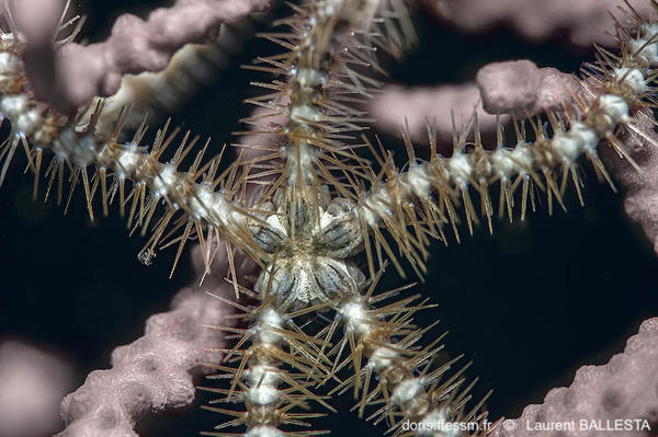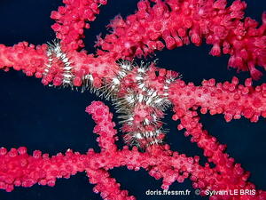 Ophiure identifiée en 2023 sur le forum DORIS : L'association apparemment obligatoire avec les gorgones, le patron de coloration très stable et la morphologie clairement distincte indiquaient qu'il s'agissait d'une autre espèce que la classique Ophiothrix fragilis. Nous venons d'avoir la confirmation par la grande spécialiste suédoise Sabine Stöhr : il s'agit d'Ophiacantha setosa (Bruzelius, 1805).