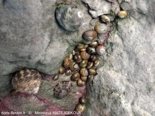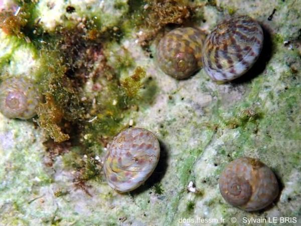 Les juvéniles de Phorcus richardi forment des colonies à l’ombre. Celle-ci a été photographiée le matin, cachée dans les enrochements de la plage à la limite de l’eau, difficilement accessible. La taille des deux grandes gibbules à gauche (Phorcus turbinatus) est supérieure à 1 cm.
