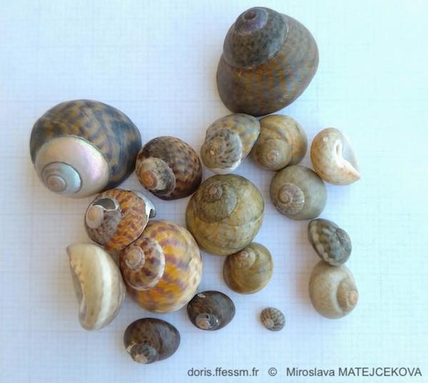 Ces coquilles de la troque de Richard ont été trouvées en épave, en laisse de mer à Hyères (83), Marseille (13) ou à Niolon/Rove (13). Elles ont toutes une forme globuleuse et aplatie (les plus petites) et sont ornées de motifs obliques rayonnantes jaune, orangé, rouge ou violet. Le grillage pâle du papier millimétré en fond permet de définir la taille des coquilles.