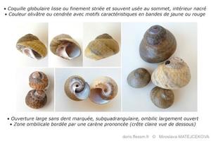 Les images montrent les différentes vues sur les coquilles en épave pour mettre en valeur les caractéristiques types : largeur supérieure à la hauteur, ouverture subquadrangulaire, nacre, ombilic ouvert bordé d’une carène pâle, apex arrondi, coloration…