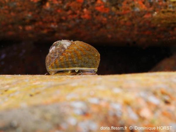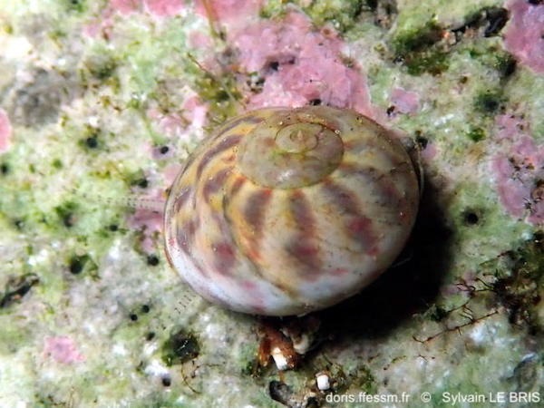 Ce spécimen de 13 mm environ, joliment décoré avec des lignes obliques rayonnantes orange et violacé a été trouvé en laisse de mer, accroché à une feuille morte de posidonie. Il a été remis à l’eau après une série de clichées. On observe la zone ombilicale blanche avec un ombilic rond et largement ouvert, recouvert en marge du côté de l’ouverture. L’opercule est corné, fin et multispiré.