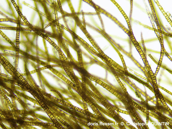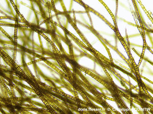 Cette microphotographie permet de voir les filaments unisériés, chaque cellule étant dotée de plastes bruns discoïdes. On peut voir que les cellules sont de longueur variable.