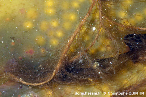 Le thalle* est ici en épiphyte* de Fucus spiralis. On voit nettement l’aspect laineux qui s’en dégage lorsqu’il est immergé.