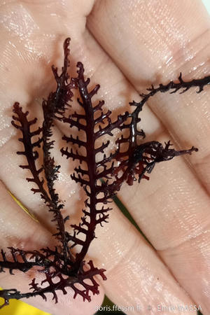 La fronde est de couleur rouge noirâtre, aplatie, ramifiée, avec des rameaux alternes aux extrémités crochues. Elle possède un pigment qui tache de rouge violacé le papier sur lequel on l'étale pour confectionner un herbier. Dans l'Antiquité Romains et Celtes utilisaient ce pigment dans la fabrication de la pourpre.