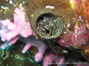 On devine, sous une algue encroûtante rose, une partie du tube de la coquille.
