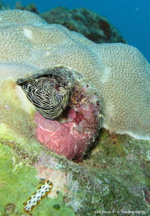 Les lignes sinueuses blanches sur un fond noir et l'absence d'opercule* sont caractéristiques de cette espèce.