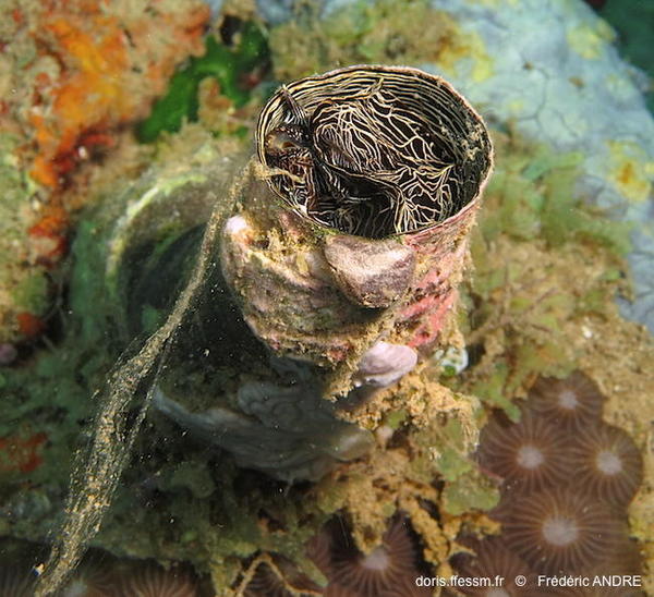 Le tube émerge du substrat et des filaments de mucus son visibles.
