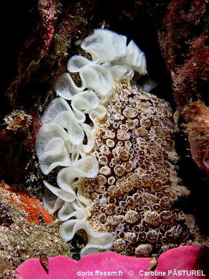 Les deux individus, logés dans une anfractuosité du coralligène, sont collés l'un à l'autre. En l'absence d'indices francs (positions des corps grâce à la présence des rhinophores, vue même partielle sur les parties génitales), on peut néanmoins imaginer que nous sommes en phase de reproduction.