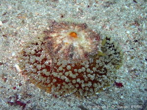 Ombrelle sur le sable se déplaçant vers la roche en quête de nourriture, sur le cliché on voit très nettement le sens de progression grâce aux rhinophores sortis.