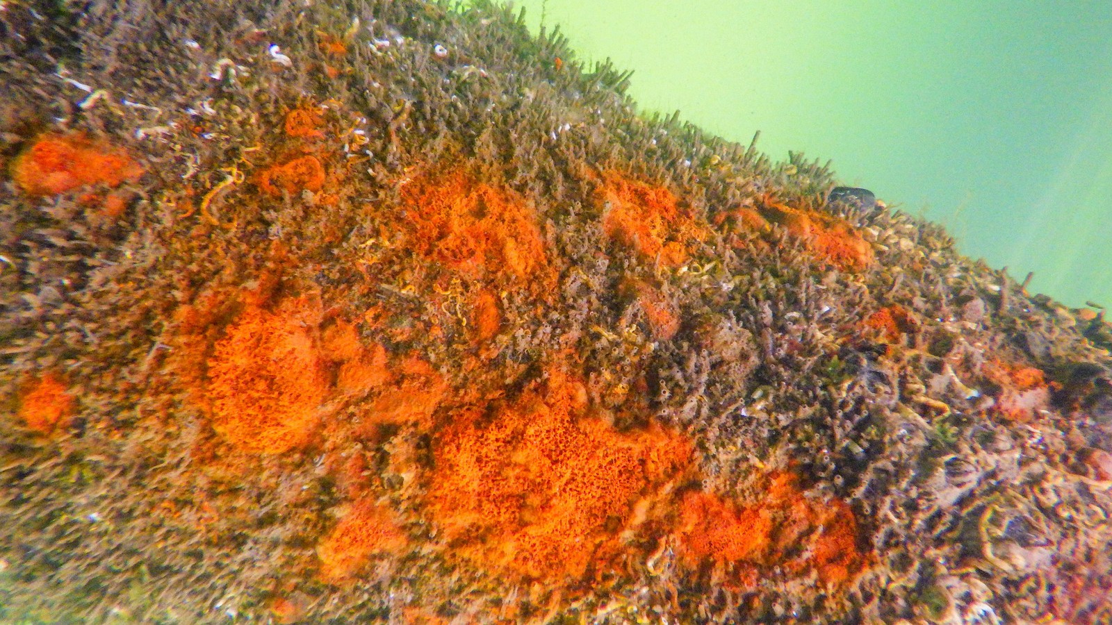 C'est sur une épave en fer ? les tâches orange me font plus penser à de la rouille que à Crambe crambe. Pour les tubes, sans plus de détails, on peut penser à des vers ou à des arthopodes.